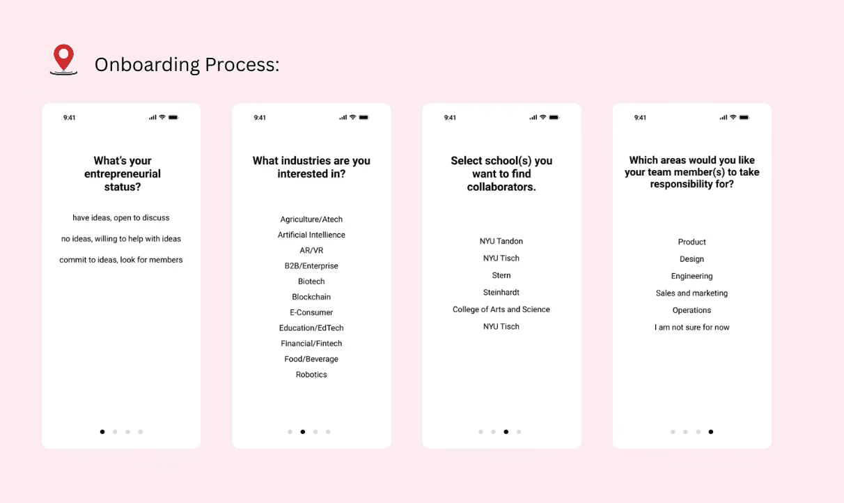 The onboarding process is strategically designed to capture four critical dimensions of collaboration: intent, interests, network and skill gap. This guided reflection transforms a vague desire for "connecting with someone" into a structured search for a partner, providing the clarity and collective confidence needed to move an idea forward.