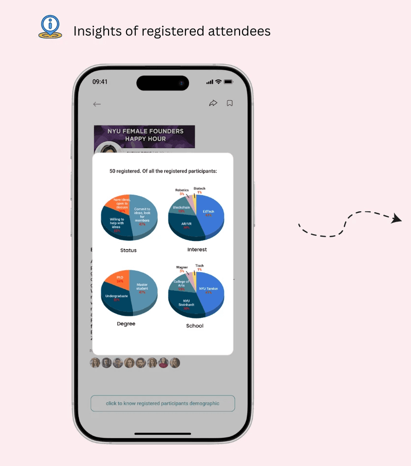 In the Event feature where entrepreneurial events are collected and listed, users get to know insights of demographic information of potential attendees (users can RSVP any events) allowing them to evaluate the community fit before they arrive.